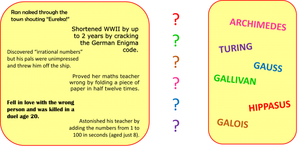 5. TELL STORIES: maths has been blessed with some amazing personalities, and sharing their stories can really help to bring maths to life. Can you match these five great mathematicians with their stories?: