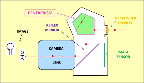 PARALLAX: Before we meet the Pentaprism, let’s look at a straight forward problem in photography: lining up the shot. To do this, most cameras have a VIEWFINDER, but as this image shows, viewfinders can lead to “parallax” problems. A simple demonstration of parallax is to hold up one finger about an inch in front of your nose; now close each eye in turn and watch as your finger appears to move side to side against the background. Voila: parallax! The same problem occurs with a camera as the viewfinder lies to the side of the camera lens: in this example, a photographer has lined up a shot beautifully through the viewfinder, only to discover that in the actual photo, Fred has a tree coming out of his head. Oh dear!