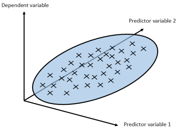 A plane of best fit on a scatter graph with two predictor variables. But what would a hyperplane-of-best-fit look like on a scatter graph with three or more predictor variables?