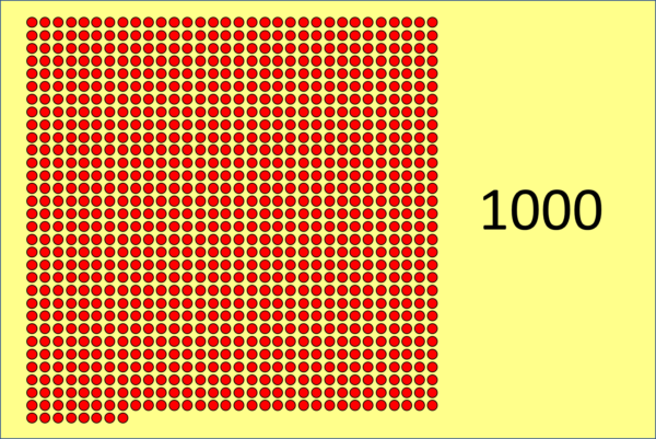 One million is so enormous that it’s very difficult to picture – but let’s try. Imagine if each of the red circles in the picture above were replaced with one thousand smaller circles, we would then have a million circles. A million is a thousand thousand!