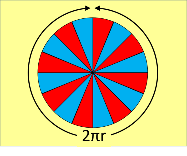 To see how big a circle is, we can cut it up into lots of thin slices (called sectors) like this: