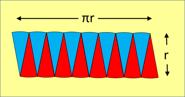 Doing this doesn’t change the area because we’re just rearranging the pieces, we’re not making them bigger or smaller. The height of this “rectangle” is just r – the radius of the circle. The length of the “rectangle” is made up of 8 short arcs, and their total length is just the distance around the original circle, or half the circumference, so half of $\pi$ x diameter, which is just $\pi$ x radius (because radius is by definition half of the diameter). So the area of the circle = area of the “rectangle” = length x width = $\pi$ x r x r = $\pi$r2. It’s not exact yet, BUT we can make it as exact as we like by slicing the circle more and more thinly into thinner and thinner sectors which, when rearranged, will get closer and closer to an exact rectangle shape. So “in the limit” (a posh term mathematicians use to explain why we can pretend it’s exact) as the sectors become thinner and thinner, the area of a circle is exactly $\pi$r2.