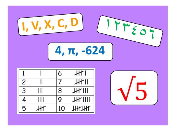 NUMBERS: are an abstract idea used to measure e.g. how many? How big? Or numbers can point to a position on a number line. Here are some examples of numbers: $4, \frac{3}{8}, 0.157, \pi, -\sqrt{2}, $ fifty-nine. There are infinitely many different numbers.